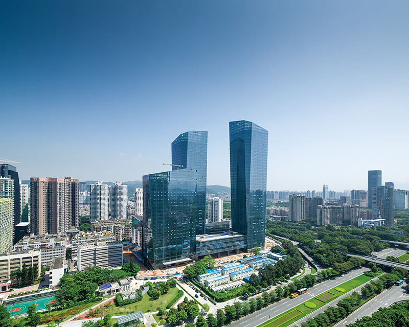 本项目位于深南路沿线突出位置。三栋晶体状建筑,以品字形布置于地块之中,以实现相互之间遮挡最小化,使三栋超高层塔楼均能充分享受到周边开阔的城市景观及绿化资源。