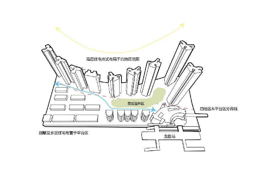 毗邻城市主干道的地铁车辆段平台区,将项目与城市完全割裂。因此车行流线在规划布局基础上,围绕基地外圈设置车行坡道,从城市主干道连接至平台上方,经由长坡爬升,从城市进入住区,生活场景在行进中缓缓展开。