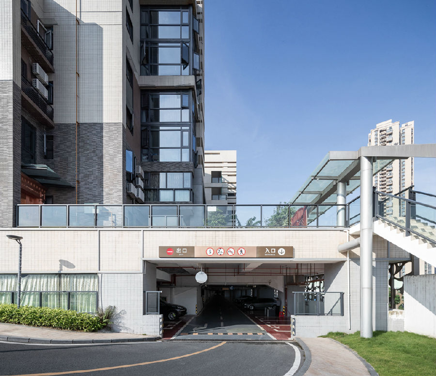 项目在整体标高体系指引下,根据平台区抬升空间尺度不同,分别设置2-4层车库,沿坡道形成4个分层出入口。形成层层叠级退台车库同时,丰富竖向空间层次,方便平台区住户就近停车。