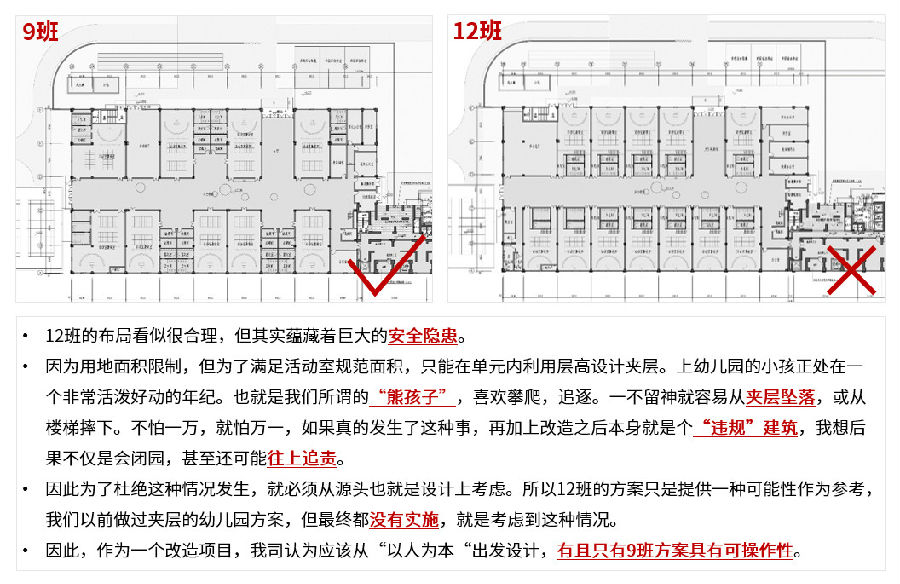 将一个3倍篮球场大小的食堂改造为幼儿园,面对原有建筑结构的限制,是采用夹层设计,不浪费一丝空间得到12班方案,还是“以人为本”出发设计,避免孩童从夹层坠落,形成9班方案?追求“数量”还是追求“品质”?我们通过对两个方案安全性进行比对分析,最终说服甲方,确定了9班方案。