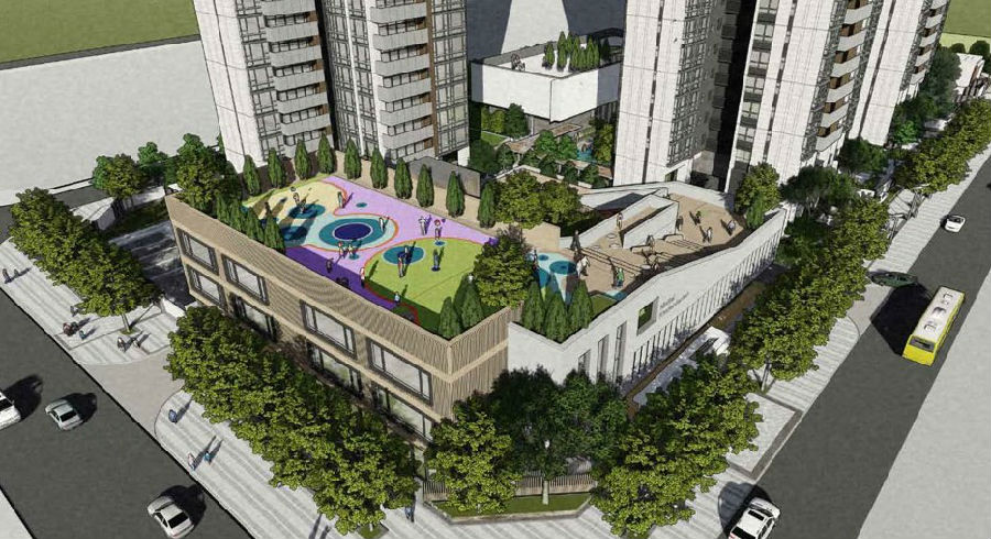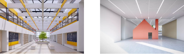 利用原有大柱跨、大层高的现有结构,打开中庭楼板,改善室内日照与通风;通过在中庭插入“小房子”,打造美术室、木工室等兴趣场所,形成安全、健康、充满关怀且富有童趣的教育空间。