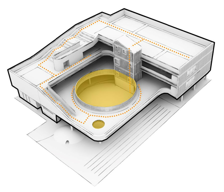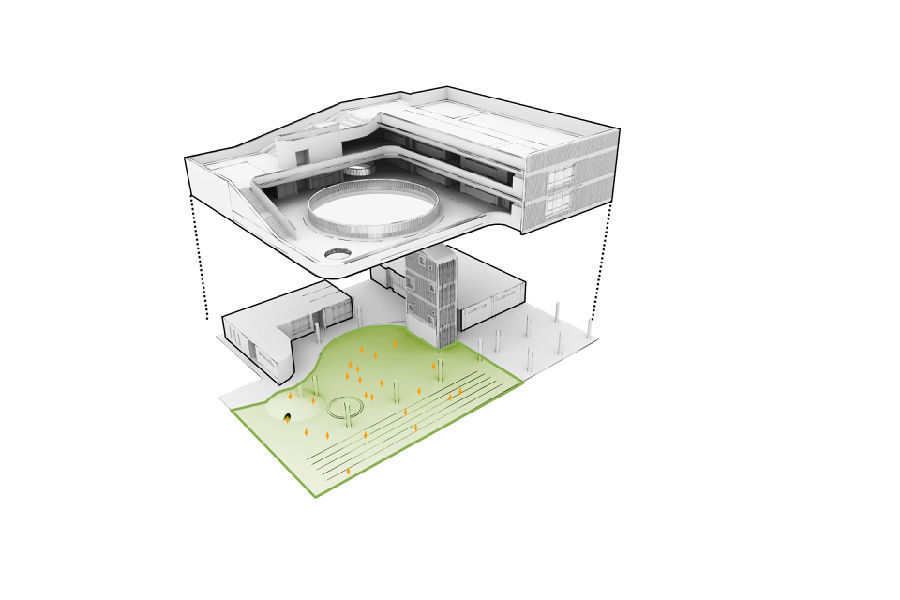 横向解决不了的问题,就用竖向的方式。我们选择去屋顶寻找答案,连通屋面,降低坡度,削弱体块,增加平台,一条357米的跑道诞生了,连通各层空间,底层架空,打破僵化界限,孩子们可以在这里自由奔跑,去寻找成长的答案。