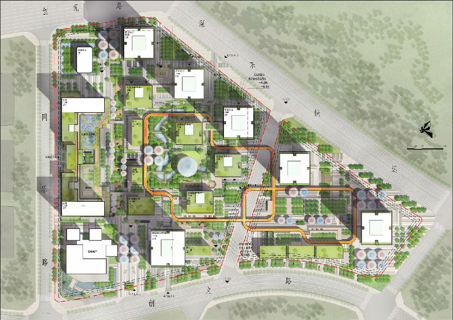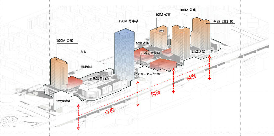 规划策略以“云栖图卷”为指引,将传统的山水意境引入现代商业建筑,打造“一轴四横”格局,将南北两侧彻底打通,连续性的商业中轴串联起云栖、创谷、城居三个组团,空间尺度及序列都非常独特,同时通过多业态的产品组合形式,提升消费体验,激发更多空间想象,最终方案一举中标。
