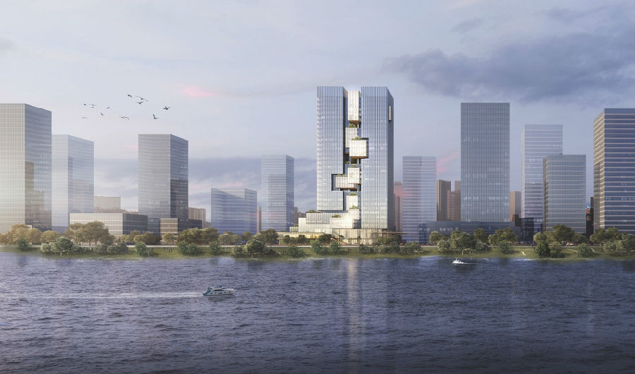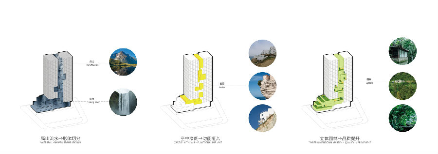 设计试图重塑中国文化符号,植入“高山流水”概念,以现代建筑手法营造山水人文意境。通过竖向语言对原本过宽的体量进行垂直切分,修正建筑比例,在不改变建筑外轮廓的前提下,将建筑中部雕凿出“有山、有水、有楼阁、有园林”的立体景观。