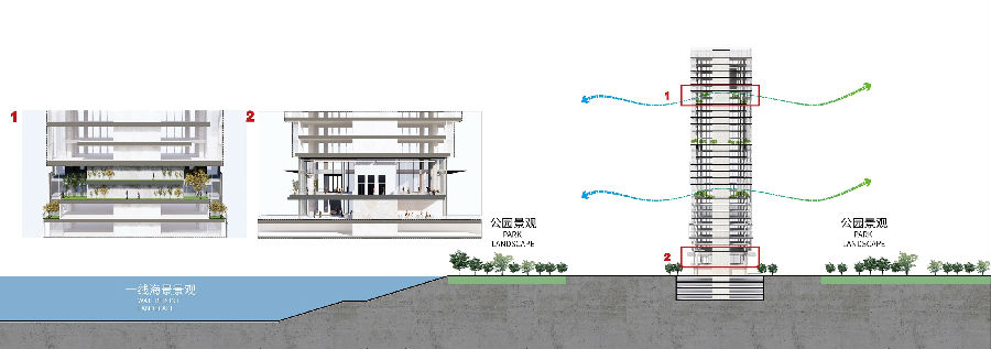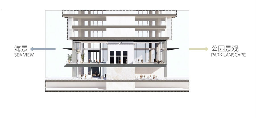 为提高建筑的公共性,设计充分利用公园和海景资源,将办公大堂抬高布置于二层,使大堂能享受海景、公园双向景观,在其西北及东北侧设置连廊,与前海片区空中步行系统衔接。同时,将塔楼西侧架空,扩大公共活动广场范围,为高密度城区提供绿化休憩空间。