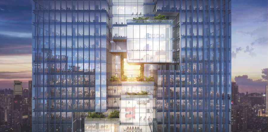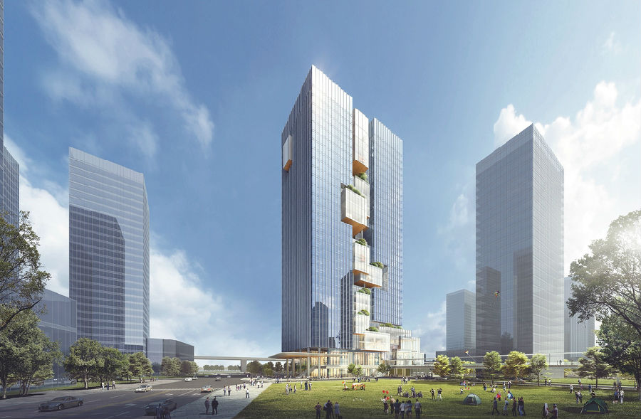 基于高山流水概念,设计将生态理念从公园、裙房退台逐级延伸至错落堆叠的BOX之中,形成全新的立体式园林,让建筑充满绿色,营造宜人的微气候环境,推动办公品质升级,构建具有极佳辨识度的“空中叠苑”。