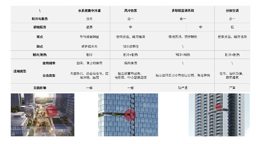 而要了解空调系统对立面的影响,就要先了解其基本的工作原理及适用范围,并对空调冷源设备尺寸有基本概念。基于这些理论和数据,建筑设计师就能根据不同项目来判断适用的空调冷源系统,并在设计初期把这些因素考虑进去来做立面设计。同时与暖通工程师积极配合,掌握多种空调冷源系统的立面处理手法。设计初期的高瞻远瞩,才能成就设计后期的游刃有余。
