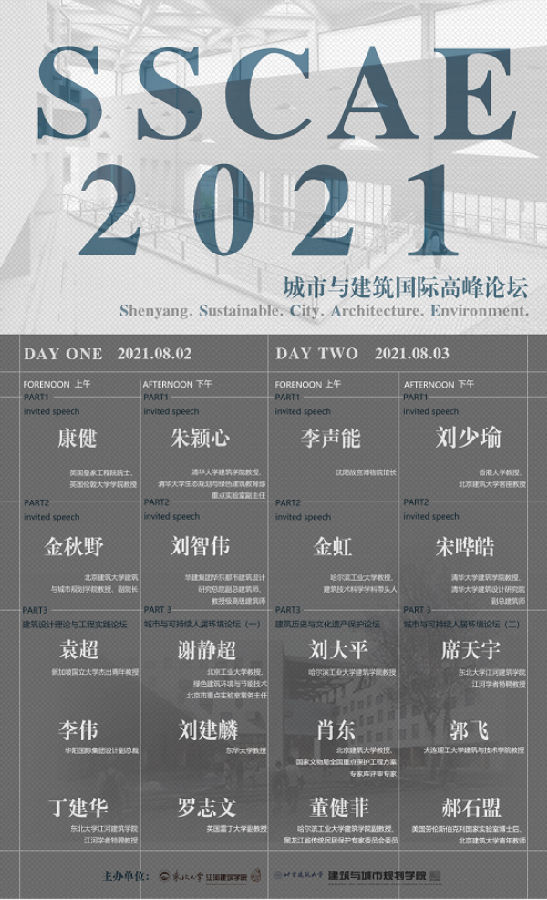 8月2-3日,“SSCAE 2021 城市与建筑国际高峰论坛”顺利举办,论坛由东北大学江河建筑学院、北京建筑大学建筑与城市规划学院联合主办,集结来自英国伦敦大学学院、清华大学等20位国内外专家学者,以8场特邀报告,4大分论坛合计12场报告,多维探讨城市环境、建筑创作、碳达峰碳中和等内容。