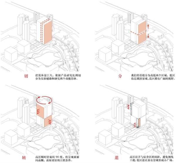 在形体变化上,设计采用“切—分—转—退”手法,既不打破现有空间尺度,又合理划分平面功能。在建筑平面上,遵循实验空间迭代策略,中间通高空间形成每三层一单元的共享空间体系,介于实验空间和办公空间之间,平面也有灵活布局的可能性。