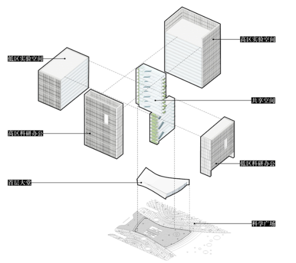 项目位于深圳南山高新科技发展轴上,是校园新科研实验区的起点,打造第三代实验室建筑,形成共享空间。设计之初,我们从实验空间的产品迭代考虑,以实验室、辅助实验和研究办公三大功能区实现空间分离,又加入一些非正式研究空间,也就是共享空间等,鼓励实验人员和科研人员之间的跨界交流,成为设计打破秩序的要点。