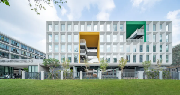 在这里,像乐高一样的装配式设计,暗藏着简单明快的设计逻辑,在这个设计中PC构件不再是简单重复,韵律感、力量感贯穿始终,实现校园多彩、个性、又极具活力。