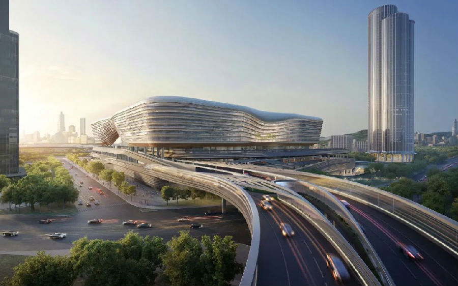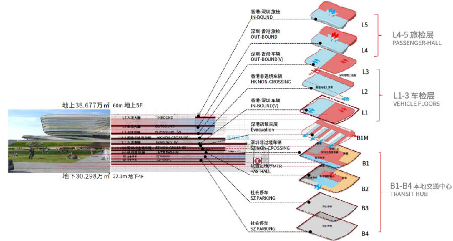 设计创造性地引入“垂直叠加、高度复合”策略,通过重构出入境大厅层、过境与非过境车辆层,以立体化的道路实现接驳交通与出入境车辆分离。