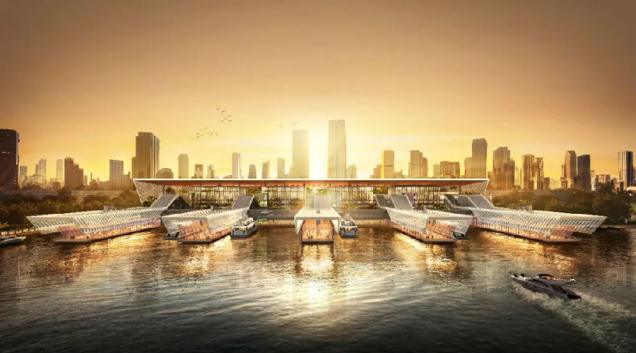 中山新客运口岸,以岭南民俗元素“龙舟”为设计概念,提取百舸争流之势,以倾斜的形体、舒展的码头指廊、线性的立面构成,表现枢纽建筑的动感与速度,在不同角度呈现富有张力的视觉体验。