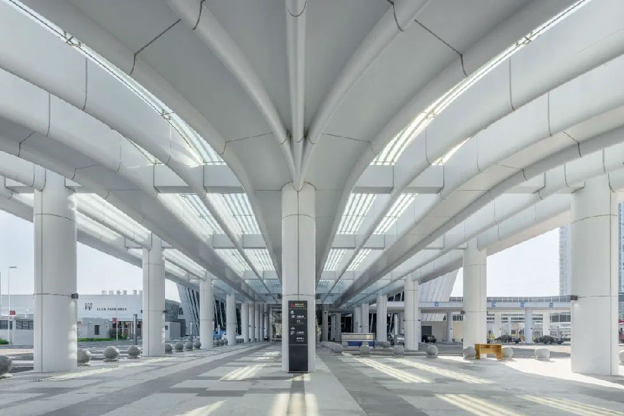 海口二线口岸,以“白浪平沙”曲线屋顶隐喻海洋文化,首层骑楼柱廊复刻南洋记忆,同时,首层拱廊结构作为承重体系,与二层轻透的膜结构差异互补,“下重上轻”,结构清晰,富于诗意,实现功能与形式的协调统一。