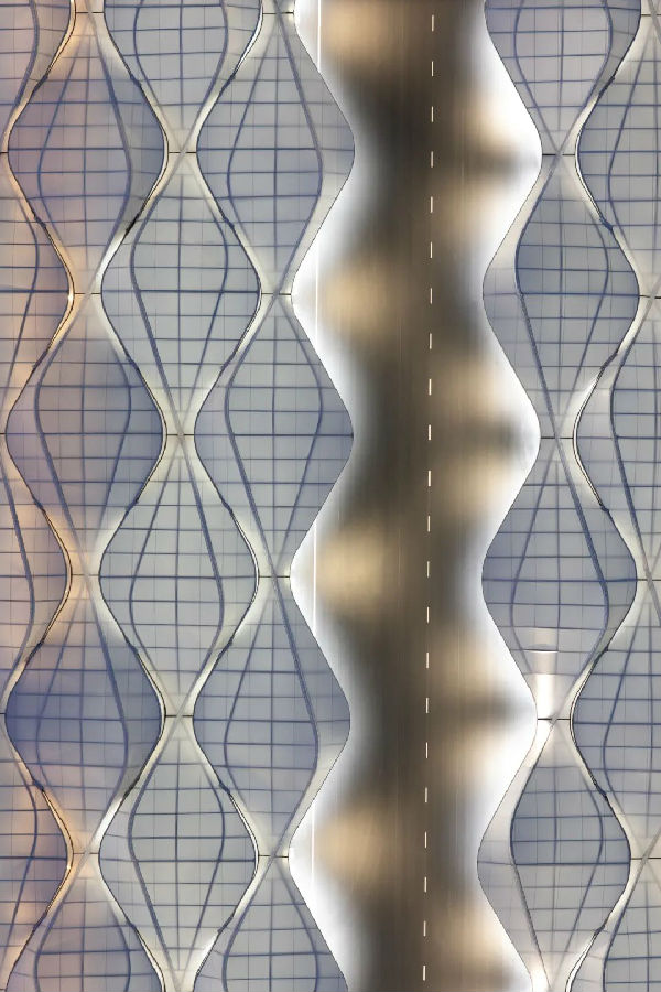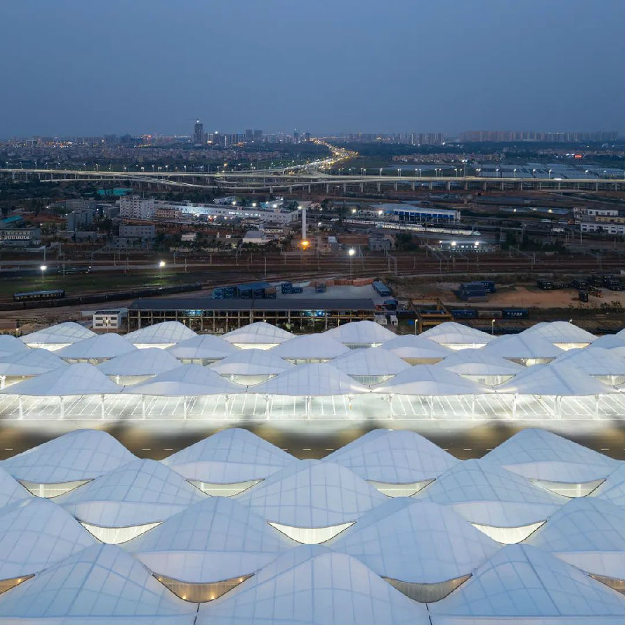 结构体系呈现"上轻下重"的智慧平衡:底层厚重拱廊承担主要荷载,顶部张拉膜展现技术轻盈感,二者通过抗震支座柔性连接。针对超大超长超高尺度建筑空间挑战,创新采用"分区消防+虹吸排水"复合系统,应对极端天气排水和板下消防难题,确保极端情况下的疏散安全。