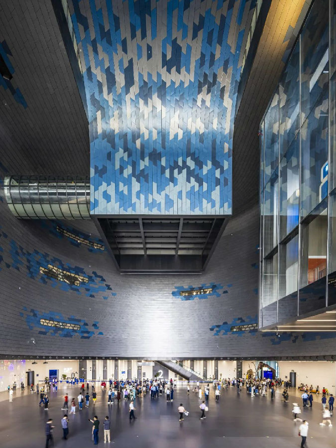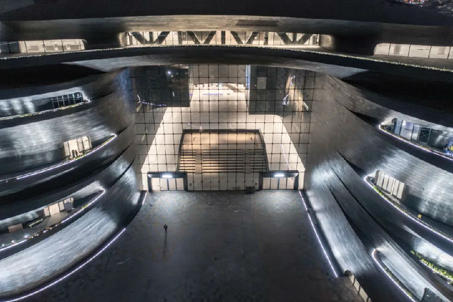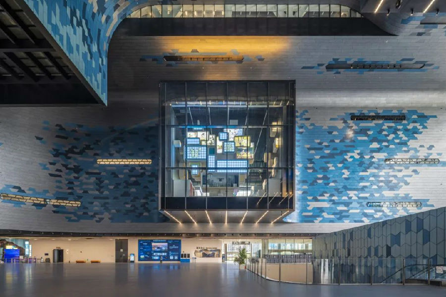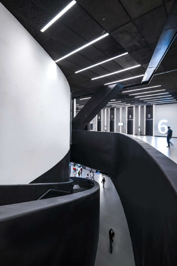 设计赋予建筑内部空间叙事性,也为各展厅间互动预留出无限可能性。建筑以最大化为原则,围绕中央庭院而设公共空间、展厅等序列空间,每个展厅的几何形态、比例和空间体验各具特色。华阳通过界定非常规空间,将特殊消防设计回归到一般消防策略应对,通过对设计规范规则的把握和理解,保证空间体验和建筑效果。