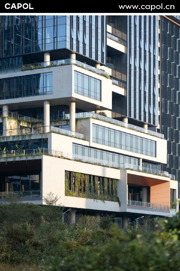 丨空间营造:突破传统办公建筑封闭的楼层空间以及单一的玻璃外墙,项目借鉴文化建筑常用手法,营造连续的绿色网格,层层错落的室外露台自上而下形成垂直绿色公园,呈现立体丰富的室内外空间。