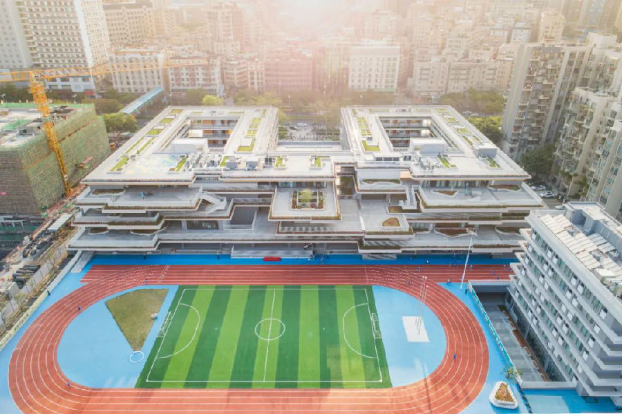 龙华区教育科学研究院附属实验学校,从静默的楼顶空间,改造成生态的“天空农场”,打造具有高辨识度、风格多变的校园第六立面风貌,是环保与教育诗意的交融。