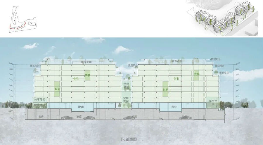 从“居住”到“共居”,项目希望以空间激发社群互动。以人为本的设计把“共享”作为建筑的组织策略:除传统居住单元外,项目在每一处交接处嵌入公共场所,形成可渗透的共享体系。同时,方案结合屋顶花园、大堂上空和退台露台等空间设计,营造了多维度、多功能的室外公共空间,为居者提供丰富多彩的运动、会客、阅读、休闲等生活空间,构建开放、互联、且富有人情温度的社区秩序。