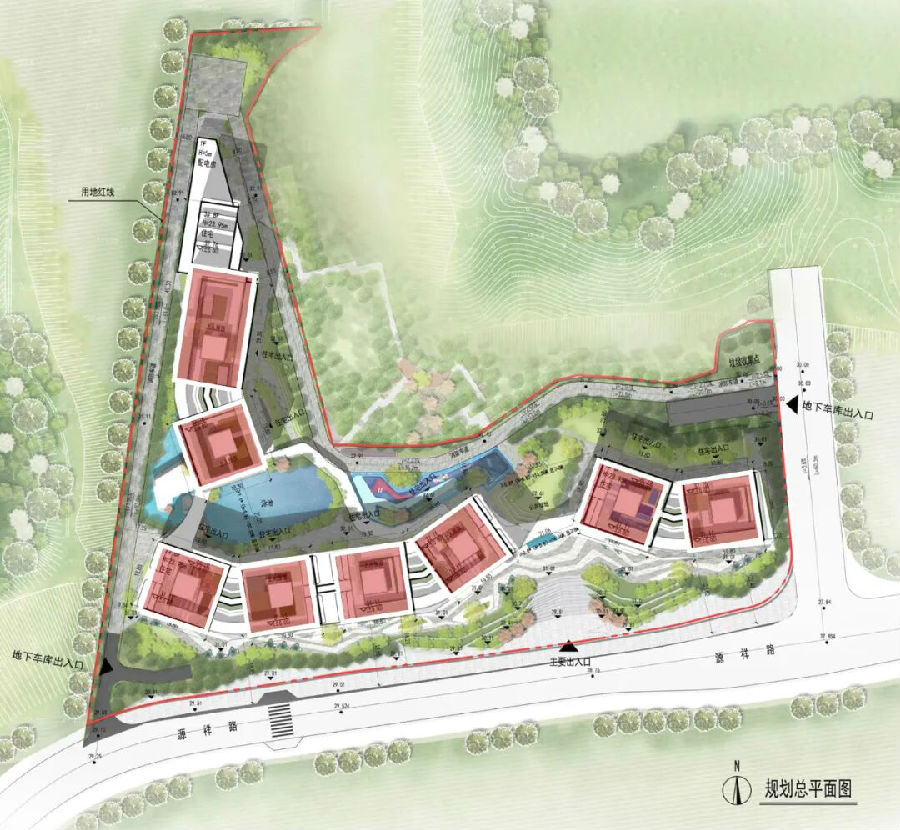 设计从基地条件出发,以顺势而为的姿态展开。L型体量顺应场地边界,既延展了城市展示界面,也让建筑朝向自然展开。体量经过切分与扭转,导出贯穿城山的视线通廊,使得景观与风流自然渗透。顶部退台的节奏与山体形态户型,立面嵌入垂直绿墙系统与多层景观平台,建筑在山脚下仿佛“自地势中生长”,形成通透、呼吸的界面。
